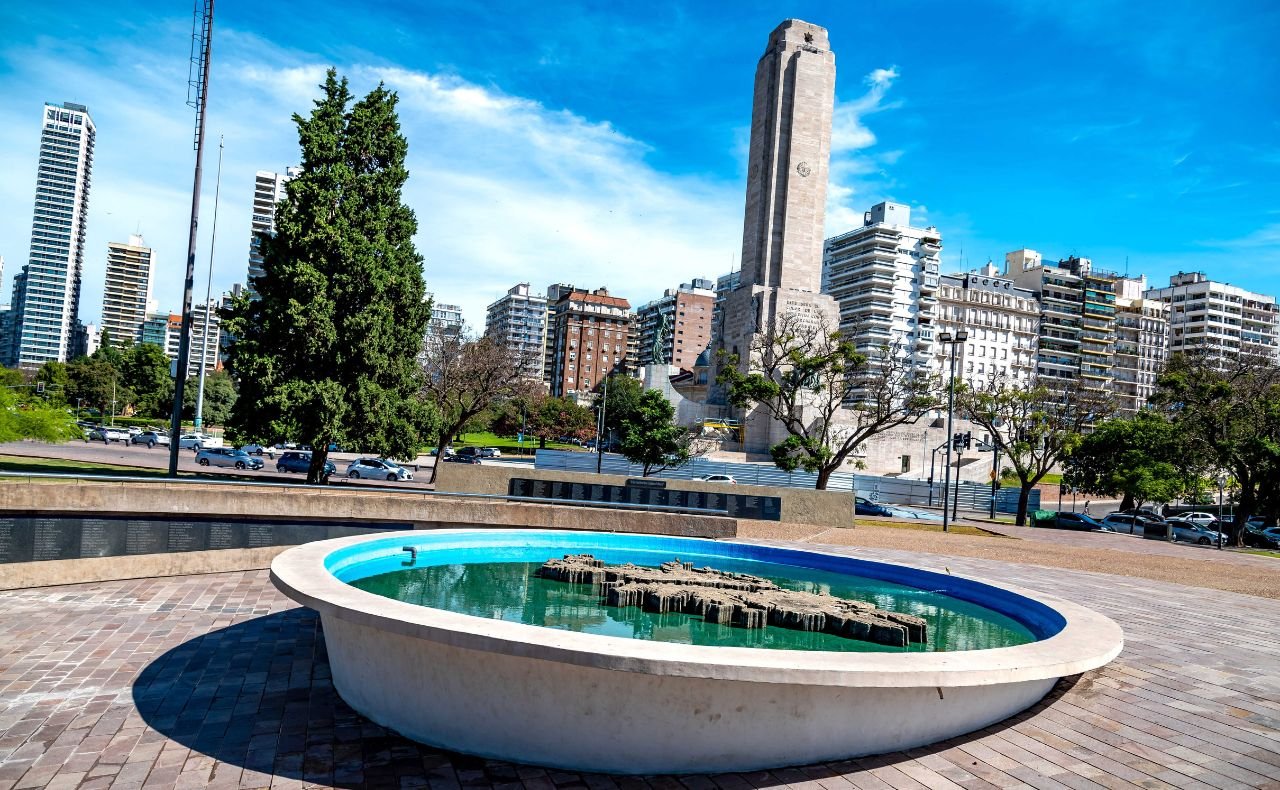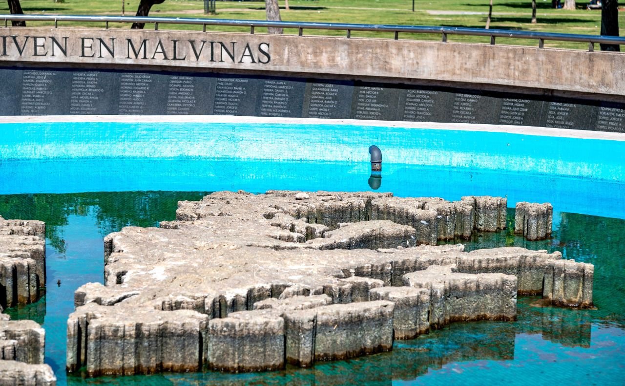 El conjunto ornamental incluye el Cenotafio con los nombres de los héroes caídos en combate y la figura de las islas Malvinas sobre el espejo de agua.