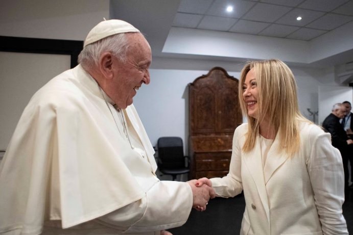 La máxima autoridad del Vaticano, de 87 años, habló con la respiración ligeramente entrecortada, pero mantuvo su típica sonrisa generosa junto a la comitiva de Meloni.