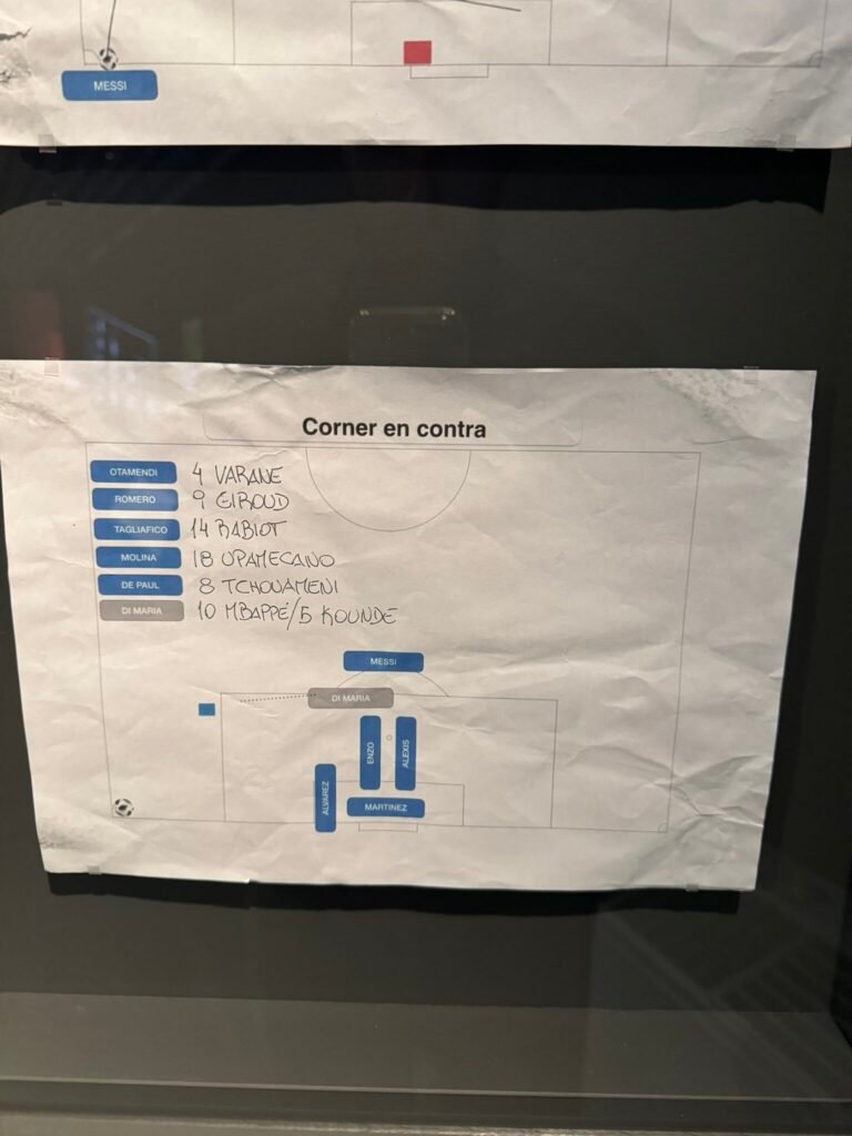 “Uno de los factores más importantes a la hora de diseñar el deporte rey es la disposición de los jugadores sobre el terreno de juego el día del partido. Lionel Scaloni dio una clase magistral de formación durante la Copa Mundial de la FIFA 2022, manteniendo a los rivales de Argentina a la expectativa sobre cómo iba a organizar a sus jugadores a lo largo del torneo. Cambió entre un 4-4-2 y un 4-3-3 e incluso se hizo eco de la disposición de Holanda jugando con cinco atrás. En la final contra Francia, Scaloni alineó a sus hombres con tres objetivos claros: cerrar el paso a Griezmann, debilitar la amenaza ofensiva de Mbappé y aprovechar los espacios en la defensa francesa. Sus notas tácticas, recogidas en el vestuario de Argentina tras la final, se exhiben ahora en nuestra exposición especial Designing the Beautiful Game”, detalló la cuenta oficial del Museo de FIFA al anunciar que esa planificación está exhibida ahora en el lugar.