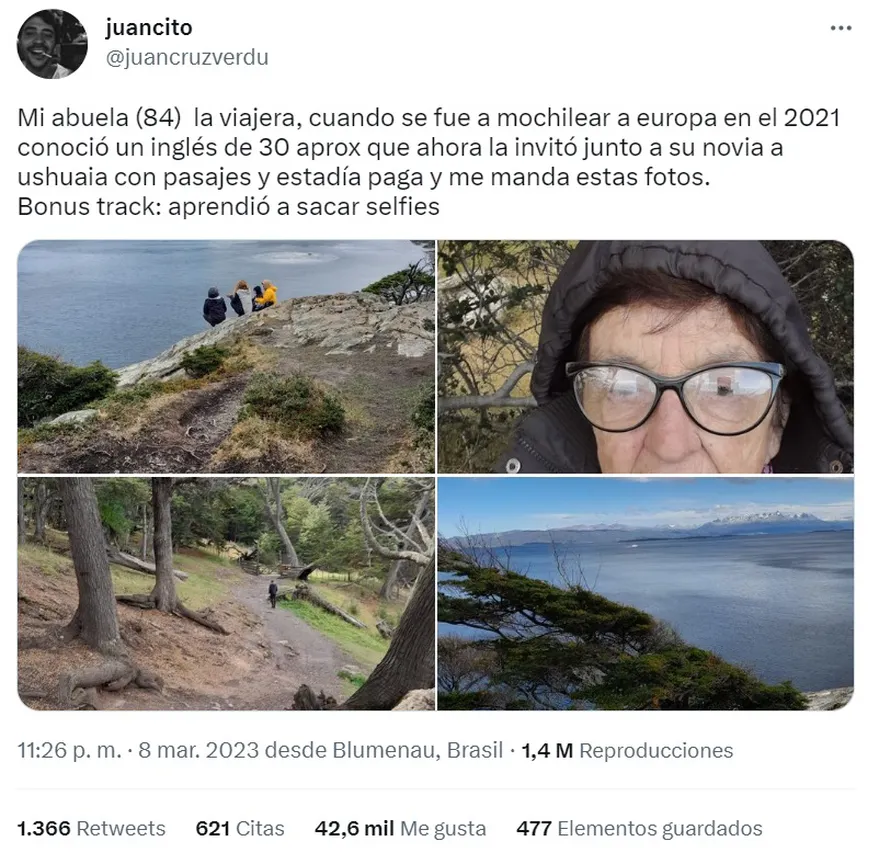 La fama le llegó de manera inesperada de la mano de un tuit viral de su nieto quien, con una serie de fotos, contó que su abuela había sido invitada de sorpresa a pasar unos días en Ushuaia junto a una pareja de extranjeros que “le enseñaron a sacarse selfies”.
