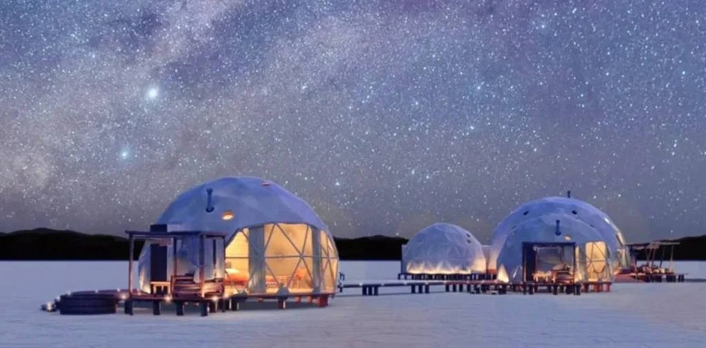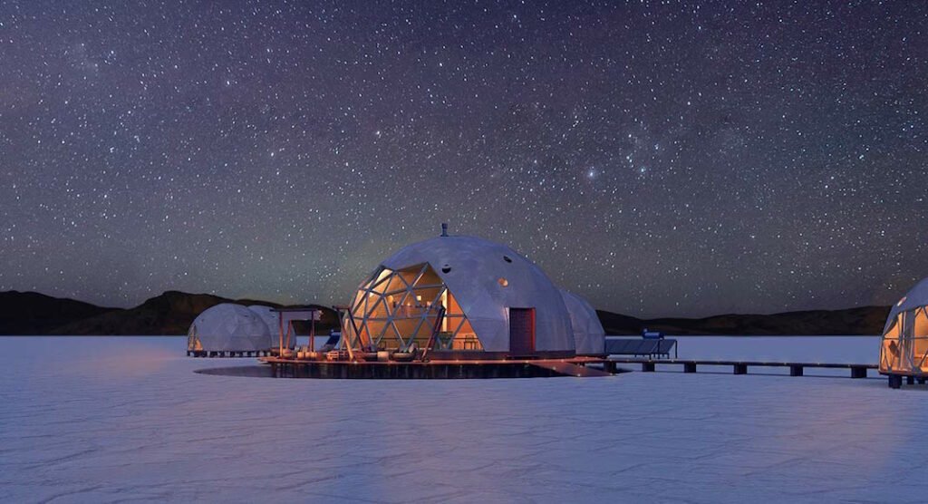 El Pristine Salinas Grandes Luxury Camps está formado por un domo central y cuatro domos-habitaciones. Tiene capacidad para hasta 10 personas y se destaca por su modalidad “glamping”, que combina la conexión con la naturaleza típica del camping con el glamour de un hotel.