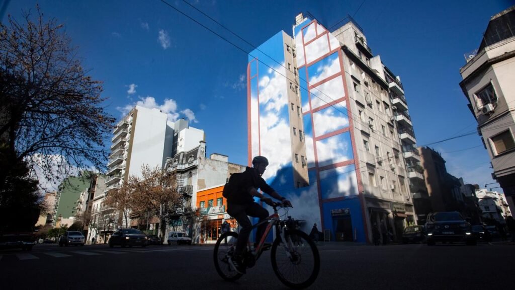 El barrio porteño de San Telmo se vio sorprendido por el estreno de un mural que representa un cielo azul intenso y algunas nubes, enmarcado por hileras de ladrillos. El autor del trabajo de 35 metros de alto por 15 de ancho es Jorge Pomar, más conocido por su seudónimo “Amor”.
