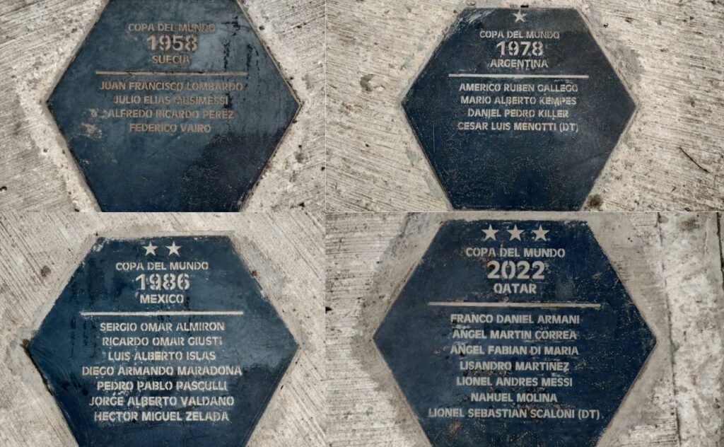 Este monumento lleva grabados en el piso los nombres de las y los 74 homenajeados distribuidos en placas de acuerdo a cada uno de los mundiales.