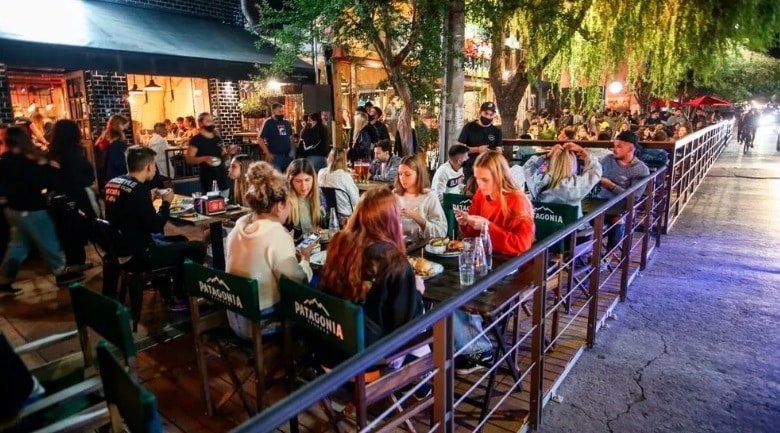 En esta época de verano, grupos de amigos llenan las veredas, mientras las luces cálidas de los locales iluminan las mesas abarrotadas y la música crea una atmósfera animada.